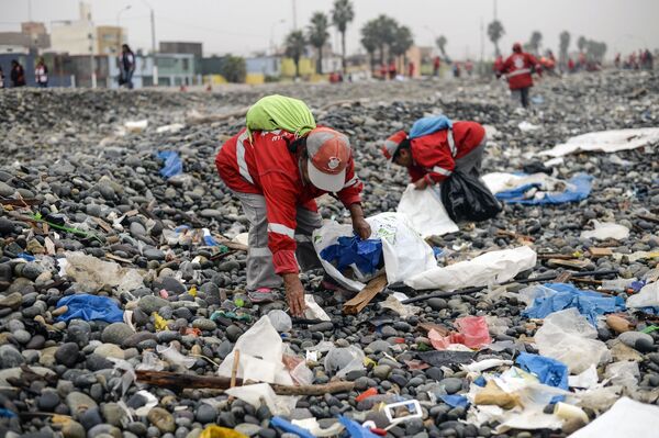 | Les ouvriers ramassant des déchets marins sur une plage à Bali, en Indonésie. |