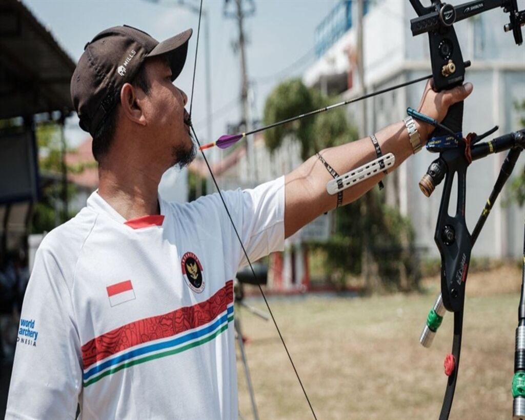 | Kholidin, archer paralympique indonésien, démontre une technique hors du commun en bandant l’arc avec les dents. |