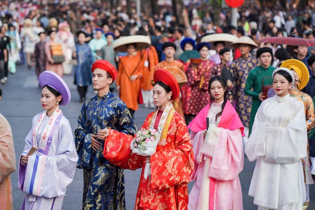 | Un défilé de costumes traditionnels vietnamiens à Hanoï. |