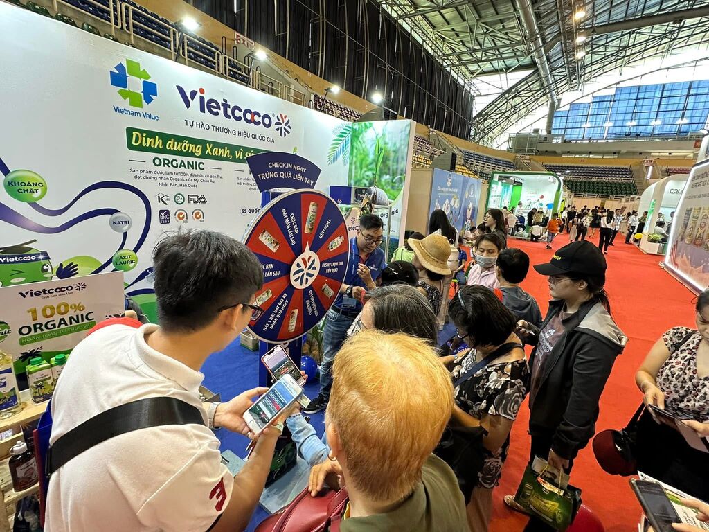 | Plusieurs visiteurs dégustent du lait au coco devant le stand de l’entreprise Vietcoo, lors d’un salon commercial tenu en juin 2024 à Hô Chi Minh-Ville. |
