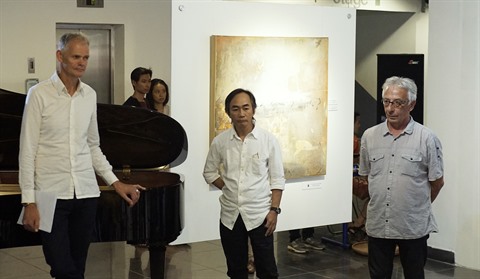 | De gauche à droit: le pianiste Mark Lockett, les calligraphes Lê Thua Tiên et Christian Hadengue. |