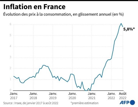 La hausse des prix à la consommation s'est élevée à 5,8% sur un an, contre 6,1% en juillet, selon les données provisoires publiées mercredi 31 août par l'Insee. Ce léger coup de frein de l'inflation est dû "au ralentissement des prix de l'énergie", lesquels ont tout de même encore gagné 22,2% sur un an, contre 28,5% en juillet.