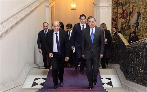 | Le conseiller d'État chinois et ministre des Affaires étrangères Wang Yi (1er, à droite) et le chef de la diplomatie française Jean-Yves Le Drian (1er, à gauche). |