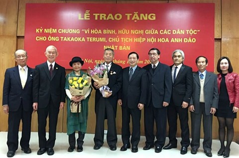 | Le président de l'Association des fleurs de cerisier du Japon, Takaoka Terumi (4e à gauche), lors de la cérémonie de remise de l’insigne «Pour la paix et l’amitié entre les nations» à Hanoï. |