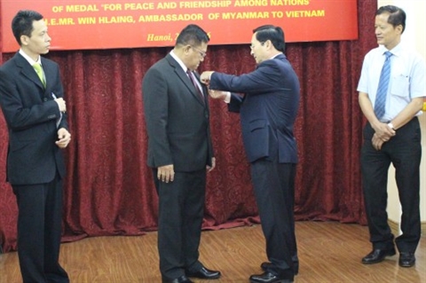 | L’ambassadeur birman Win Hlaing s'est vu attribuer l'Insigne pour la paix et l'amitié entre les nations du Vietnam, le 29 juin à Hanoi. |