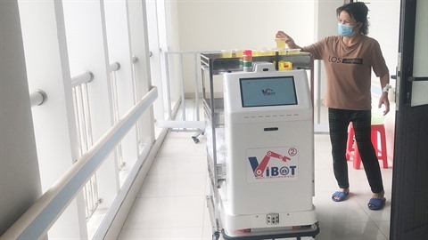 | Un robot livrant de la nourriture et des médicaments aux malades du COVID-19 dans un hôpital. |