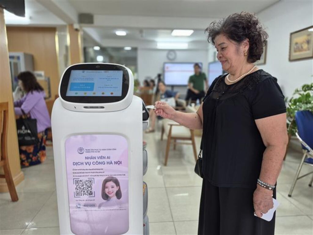 | Une habitante fait l'expérience de robots IA appliquant la technologie de l'intelligence artificielle pour soutenir les procédures administratives dans le quartier de Cua Nam, dans la ville de Hanoï. |