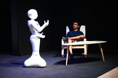| Un étudiant de l'École de Mines de Nancy "dialogue" avec le robot Pepper dans le spectacle Bot4Human dans le cadre du Festival d'Avignon, le 14 juillet. |