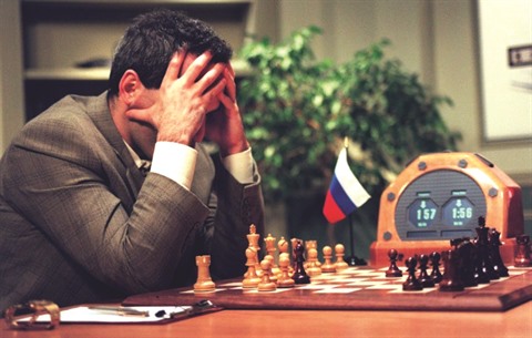 | Garrry Kasparov lors d’une partie d’échecs contre l’algorithme Deep Blue d’IBM, le 10 mai 1997 à New York. |