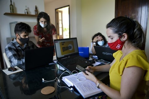 | Les employés de Mandao, un service de livraison de produits alimentaires, gèrent les commandes sur Internet à La Havane, le 19 novembre 2020. |