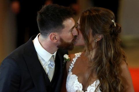 | Lionel Messi et son épouse s'embrassent devant l'hôtel Pullman City Center de Rosario (Argentine) le 30 juin. |