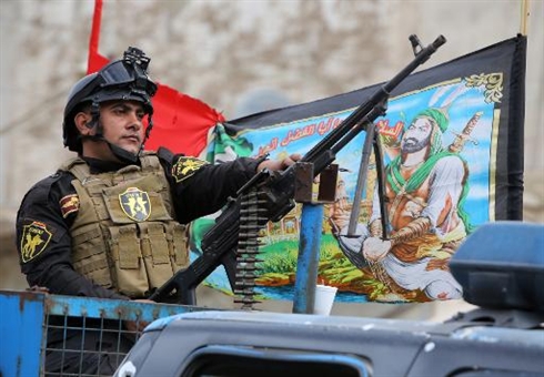 | Un membre des forces spéciales irakiennes surveille les célébrations de l'Achoura à Bagdad, le 3 nov |