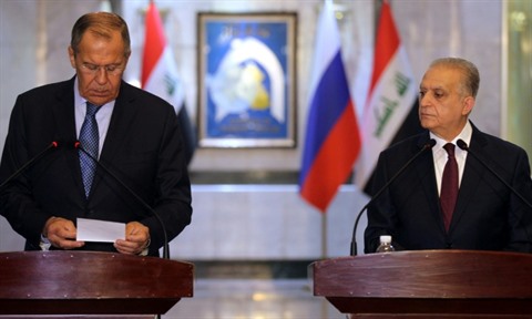 | Sergey Lavrov (gauche) et son homologue irakien Mohamed Alhakim, à Bagdad le 7 octobre. |
