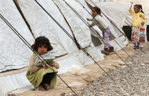 | Des enfants déplacés en Irak par le conflit contre le groupe jihadiste État islamique (EI) se rendant dans une école financée par l'ONU et installée dans un camp dans le Nord du pays, le 20 novembre. |