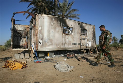 | Un combattant irakien du Hachd al-Chaabi (Forces de mobilisation populaire) inspecte le site de l’attaque du groupe État islamique (EI) sur une unité de cette force paramilitaire à environ 180 km au nord de Bgadad, le 3 mai. |