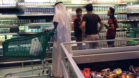 | Des clienst font leurs courses dans un supermarché Al-Meera à Doha au Qatar, le 10 juin 2017. |