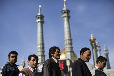 | Des hommes près d'un bureau de vote à Qom, en Iran, le 26 février. |