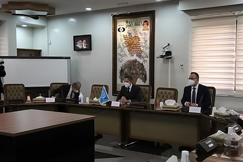 | Photo fournie par l'Organisation iranienne de l'énergie atomique du directeur de l'AIEA, Rafael Grossi (centre), lors d'une réunion à Téhéran, le 21 février. |