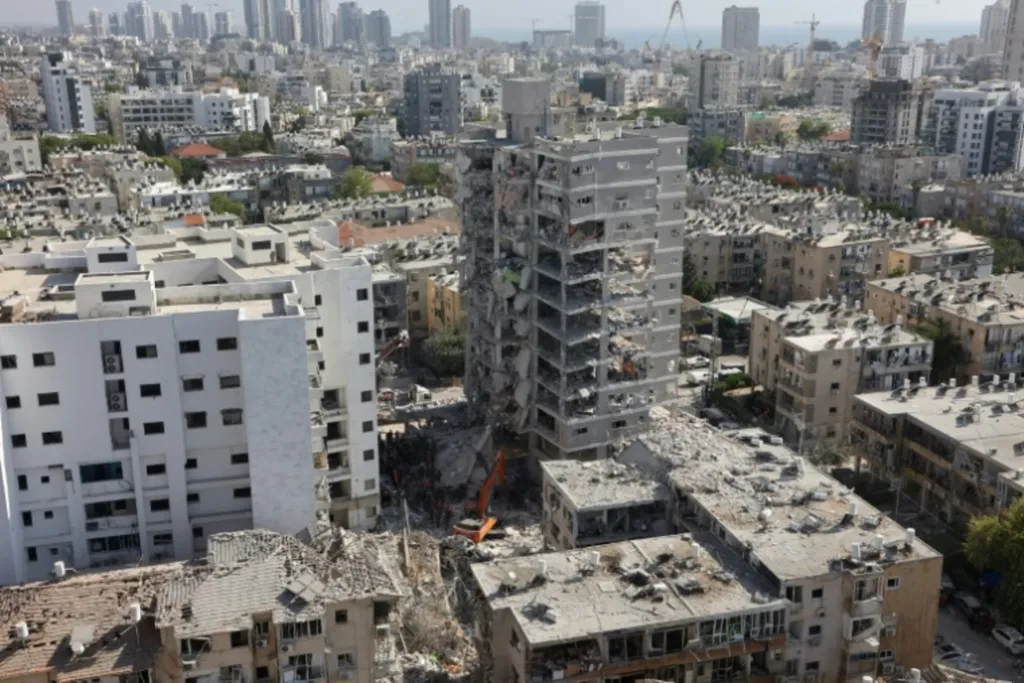| Des immeubles endommagés par une attaque de missiles iraniens à Bat Yam, dans la banlieue de Tel-Aviv. |