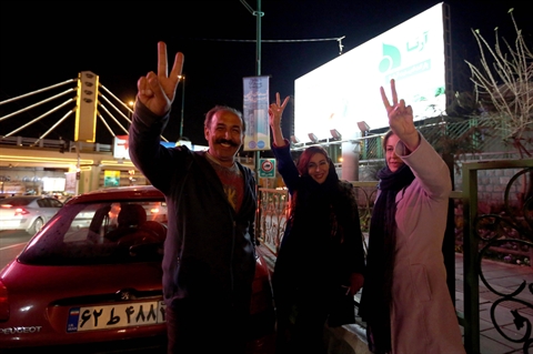 | Les gens ont fait le symbole de victoire sur la rue de Téhéran, le 2 avril, aux informations de fin des discussions sur le programme nucléaire iranien. |