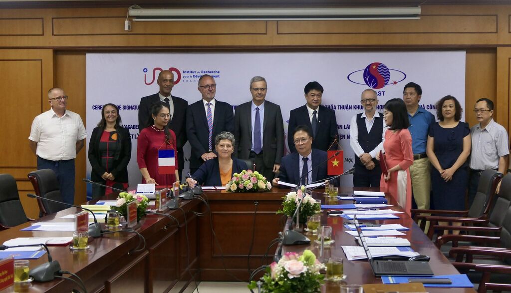 | Cérémonie de signature de l’accord-cadre entre l'IRD et l’Académie des sciences et des technologies du Vietnam, le 12 juillet à Hanoï. |
