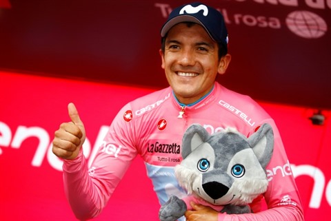 | L'Équatorien Richard Carapaz, maillot rose du Giro, sur le podium au terme la 17e étape, le 29 mai à Anterselva (Italie). |