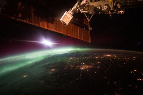 | Photographie prise par l'astronaute Scott Kelly de la lumière verte de l'aurore vue depuis la Station spatiale internationale le 7 octobre. |