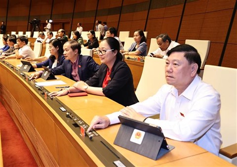 | Les députés lors d'une séance de travail de la 11e session de la XIVe législature de l’Assemblée nationale, le 7 avril à Hanoï. |