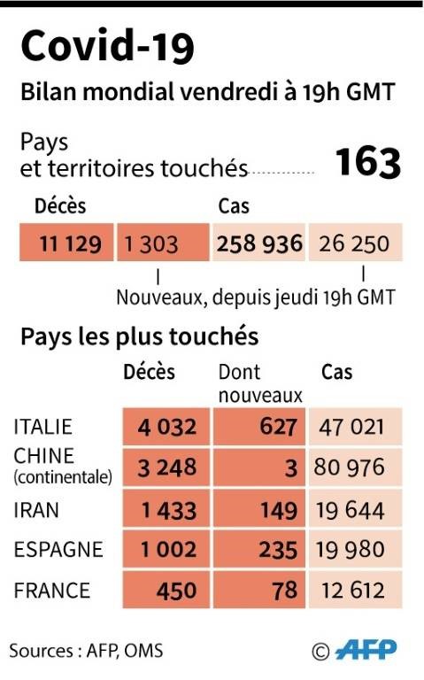 Qualifié d'"ennemi de l'humanité" par l'Organisation mondiale de la santé (OMS), l'épidémie de COVID-19 a jusqu'à présent contaminé près de 260.000 personnes dans le monde, selon les derniers chiffres recensés.