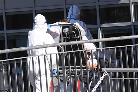 | Le personnel médical transfère un patient infecté par le COVID-19 à un hôpital de Bologne, en Italie, le 9 avril. |