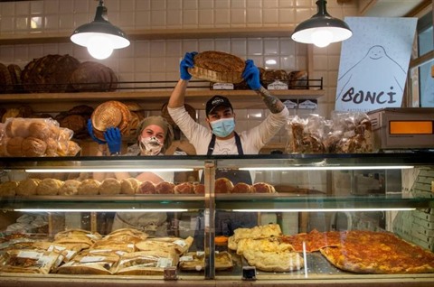 | Des employés d'une boulangerie sur la via Trionfale à Rome, le 23 mars. |