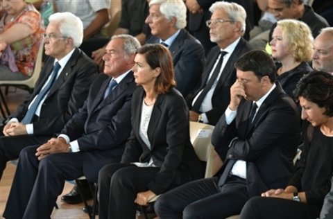 | Le président italien Sergio Mattarella (gauche), le chef du gouvernement Matteo Renzi (2e droite) et sa femme Agnès (droite) assistent à une messe de funérailles en hommage aux victimes du séisme, à Ascoli Piceni, le 27 août 2016. |