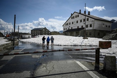 | Des touristes devant la frontière fermée entre la Suisse et l'Italie au col du Grand Saint Bernard le 2 juin. |