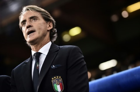 | Le sélectionneur de l'Italie, Roberto Mancini, lors d'un match amical de la Nazionale contre l'Ukraine le 10 octobre 2018 |