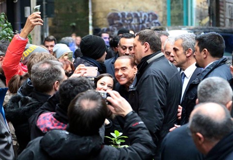 | Silvio Berlusconi (centre) pose avec ses sympathisants lors d'une visite à Naples le 3 mars 2018, à la veille des élections législatives. |