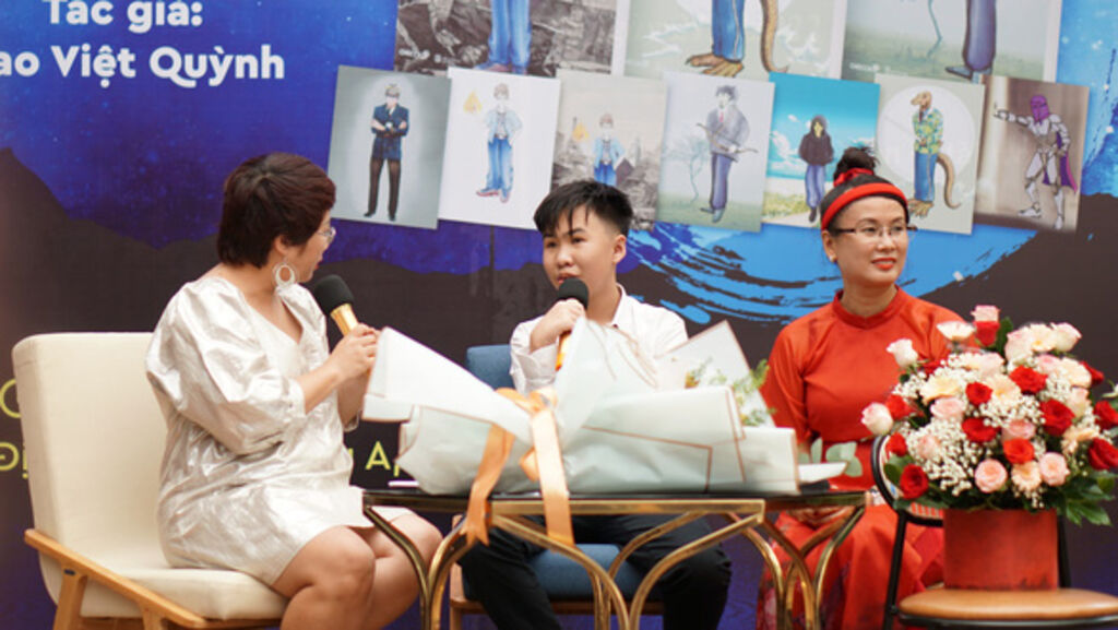| Le jeune auteur Cao Viêt Quynh (centre) et sa mère (droite) lors d'un échange avec des lecteurs. |