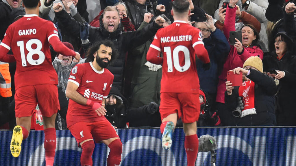 | Auteur d'un doublé face à Newcastle, Mohamed Salah (2e à gauche) a été le grand artisan de la victoire de Liverpool (4-2) le 1er janvier 2024 à Anfield. |