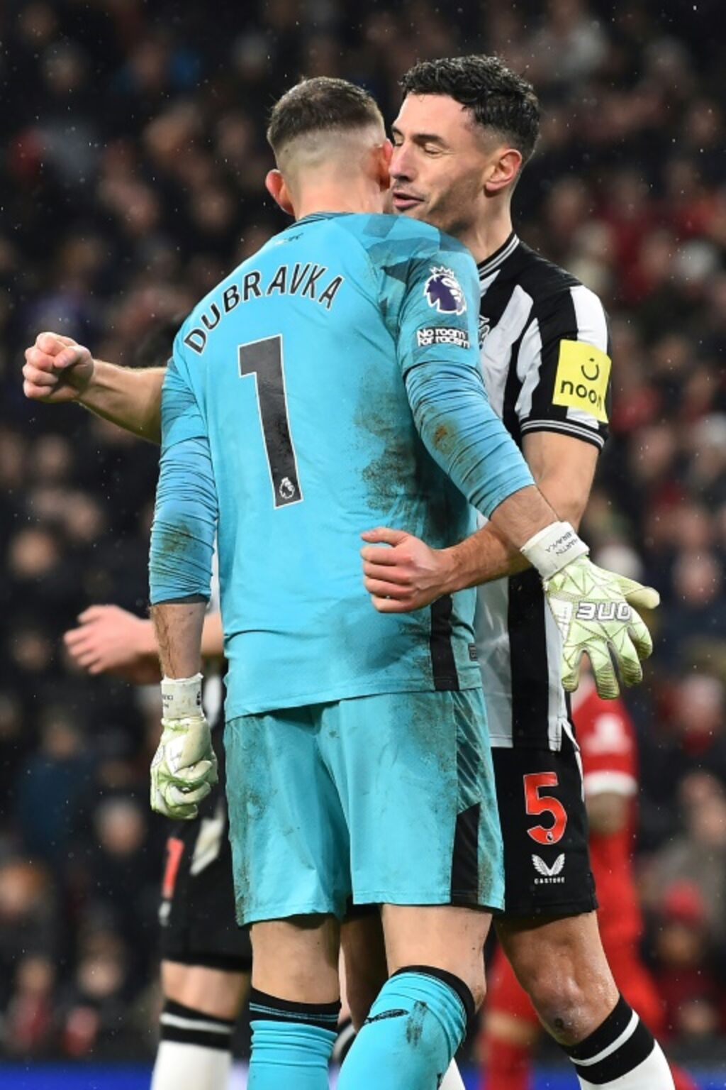 | Le défenseur suisse de Newcastle Fabian Schär (droite) félicite Martin Dubravka : le gardien slovaque des Magpies vient de repousser un pénalty de Mohammed Salah, le 1er janvier. |