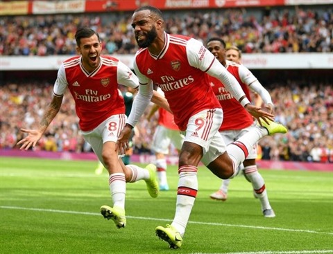| Le joueur d'Arsenal Alexandre Lacazette (c) buteur lors de la victoire sur Burnley à Londres le 17 août 2019. |
