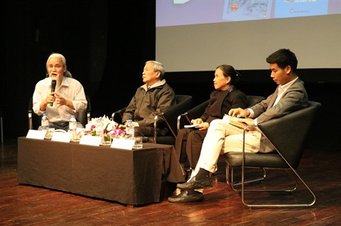 | Les intervenants à la table ronde (de gauche à droite) : le critique littéraire Pham Xuân Nguyên, l’ancien ministre de la Culture, Nguyên Khoa Diêm, l'historienne Bùi Trân Phuong et l’auteur Doàn Anh Duong. |