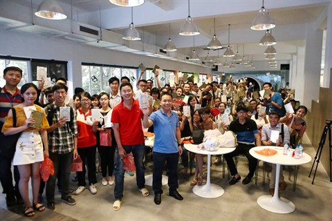 | L'auteur Dung Phan (en T-shirt bleu, 1er rang) avec les jeunes lecteurs lors de la séance de présentation du livre Su Viêt-12 khuc trang ca |