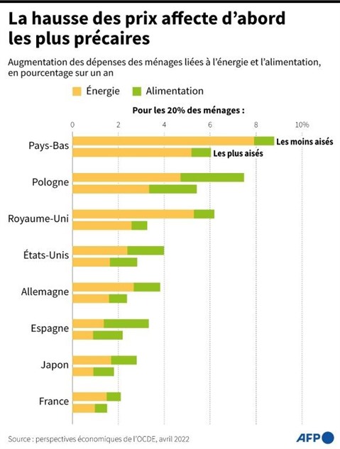 | Augmentation de la part des dépenses liées à l'énergie et à l'alimentation pour les ménages les plus et les moins aisés, dans une sélection de pays de l'OCDE. |