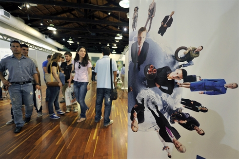 | Des jeunes cherchent un emploi dans une foire à Athènes. |