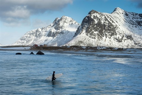 | Une surfeuse sur la plage de Flackstad, en Norvège, près du cercle polaire |