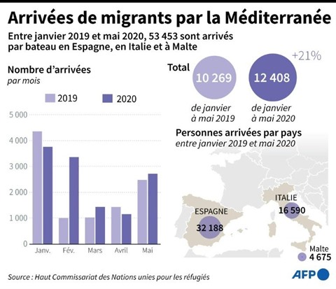 | Arrivées de migrants par la Méditerranée entre janvier 2019 et mai. |