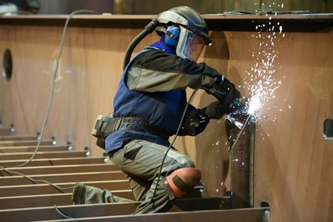 | Un ouvrier du chantier naval de Flensburg (Allemagne) le 14 décembre 2018. |