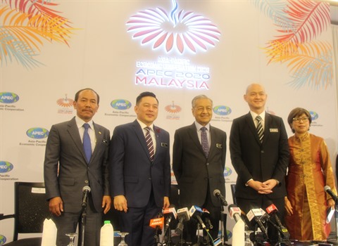 | Le Premier ministre malaisien Mahathir Mohamad (centre) et des officiels malaisiens participant à la conférence sur l'Année APEC 2020. |