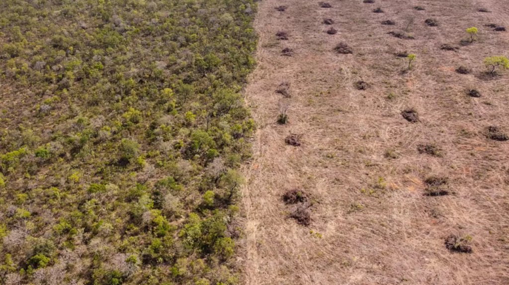 | Vue aérienne de la déforestation dans le Cerrado, le 25 septembre 2023 dans l'État de Bahia, au Brésil . |
