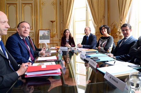 | Le patron du Medef, Pierre Gattaz (2e gauche), le Premier ministre Manuel Valls (droite) et la ministre du Travail, Myriam El Khomri (2e droite), lors d’une rencontre le 30 juin à Paris. |