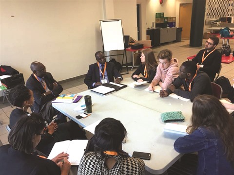 | L’administrateur de l’OIF, Adama Ouane (centre), interviewé par des jeunes reporters lors de la 58e session de la CONFEMEN. |
